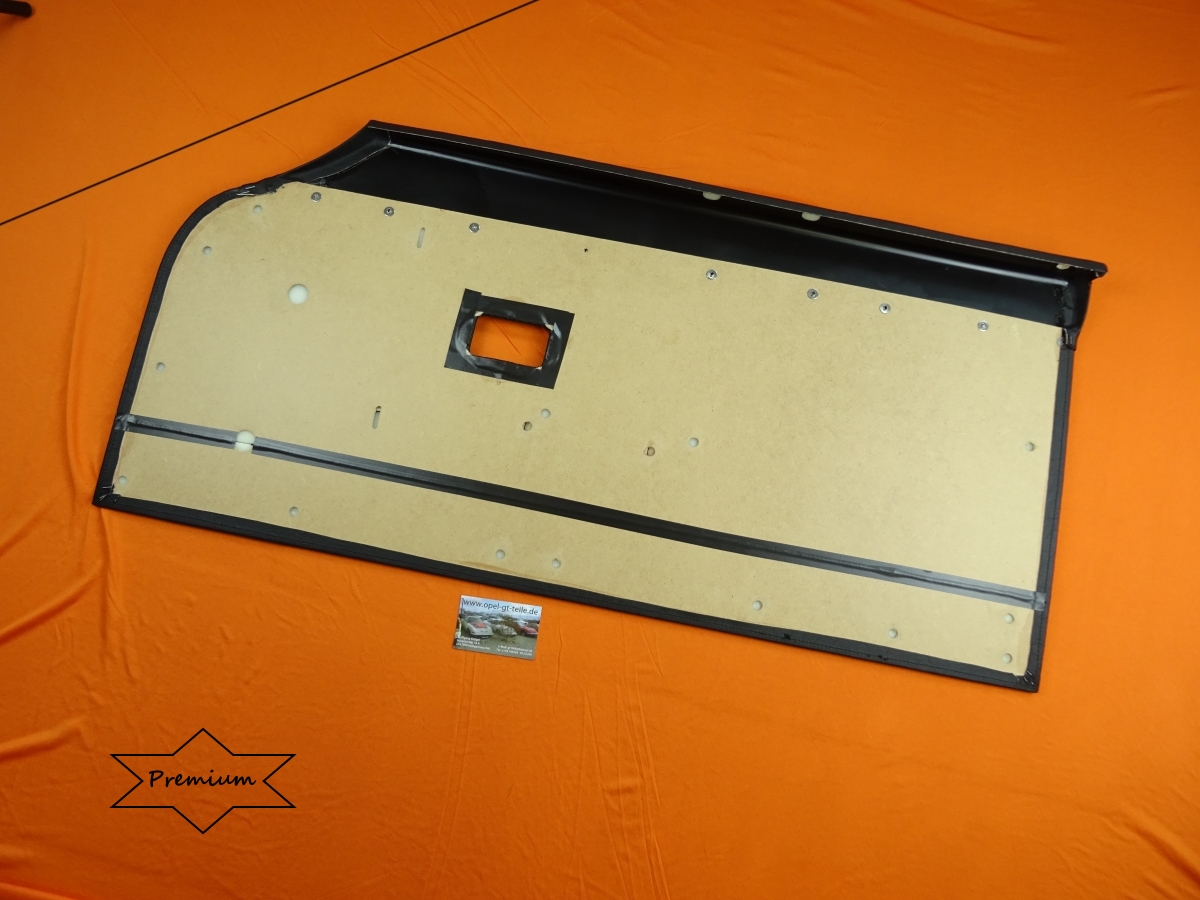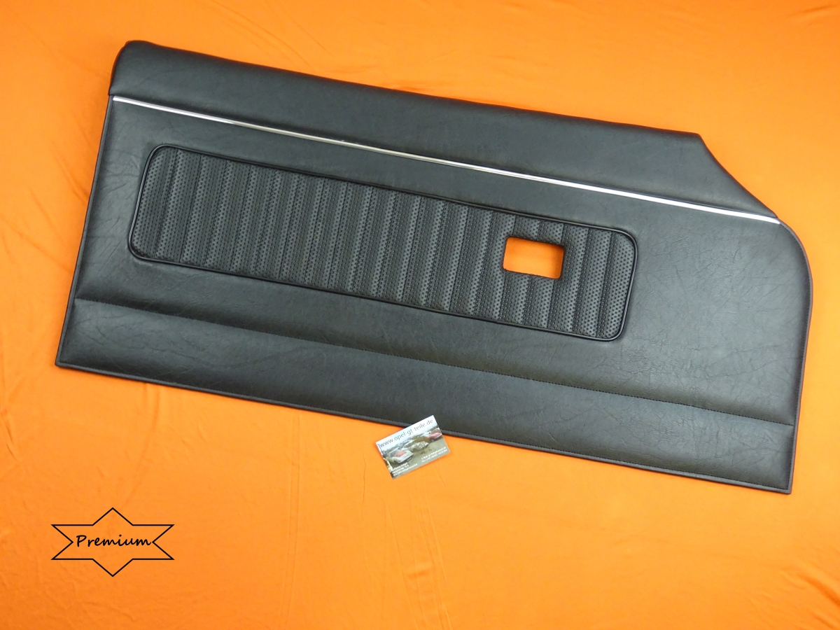 Neue schwarze Türverkleidung in Premium-Qualität für die Fahrertür des Opel GT/AL, original Look mit Chromleiste... Der Grundträger auf der Rückseite ist neu, gebraucht ist hier nur die Oberkante (Blechteil), diese benötigen wir vorab im Austausch. Auf den Bildern ist hier auch die umlaufende Naht am Rand zu erkennen, sie ist so zu sagen das i-Tüpfelchen und sollte bei einer Top-Türverkleidung nicht fehlen... Diese Türverkleidung ist nur schwer vom Original zu unterscheiden, wirklich ein sehr edles Teil.
