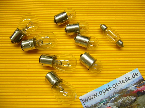 Hier erhalten Sie einen 9 teiligen Satz neuer Glühbirnen für die Opel GT Heckbeleuchtung. Alle Birnen in Top Qualität und natürlich mit der richtigen Wattleistung.